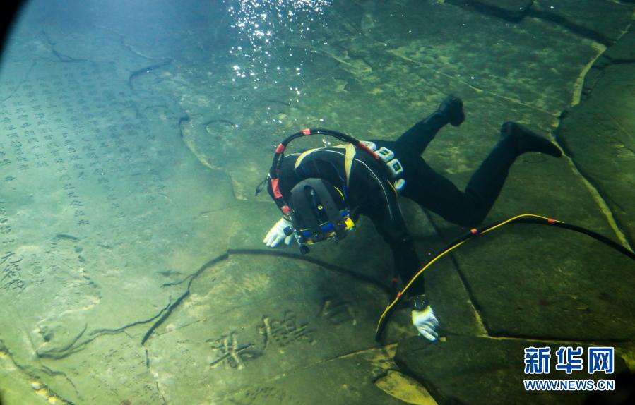 3月15日,在長江水下40多米的白鶴梁題刻無壓容器罩內(nèi),潛水員在進行清理作業(yè)。新華社記者 劉潺 攝
