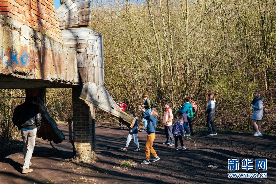 3月20日,人們在比利時(shí)博姆市的德舒爾森林公園和一座“巨人”雕塑“玩耍”。新華社記者 張鋮 攝