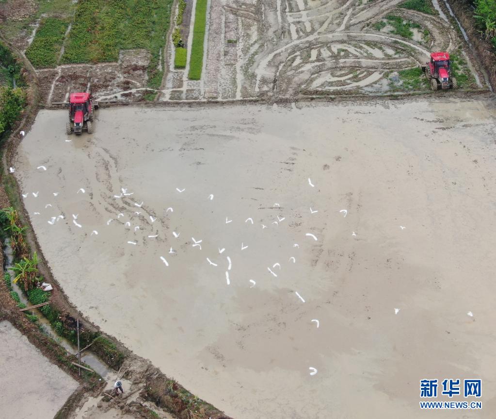 4月5日,云南西雙版納傣族自治州勐海縣勐遮鎮(zhèn)曼么勒村的農(nóng)民駕駛拖拉機(jī)耕田(無(wú)人機(jī)照片) 。