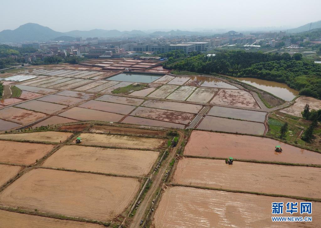 4月6日,浙江省金華市武義縣白洋街道沈宅村農(nóng)民駕駛農(nóng)機(jī)在田間插種早稻(無人機(jī)照片)。