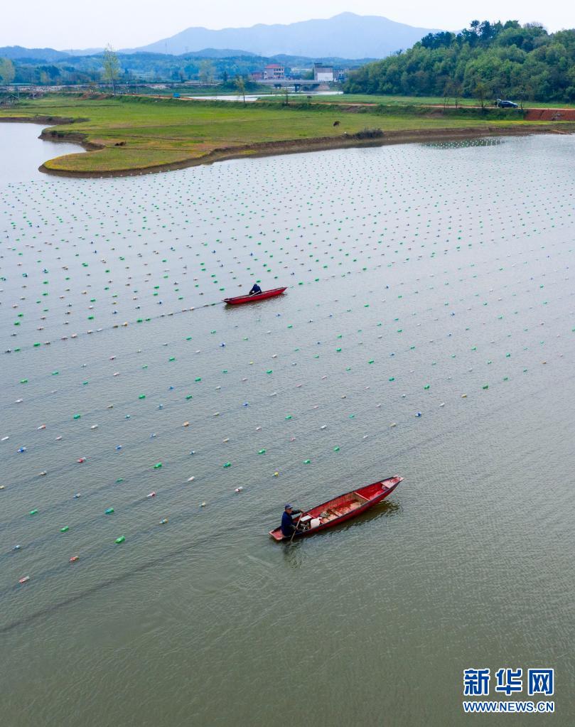 4月6日,在江西省九江市都昌縣新妙湖畔珍珠養(yǎng)殖基地,蚌農(nóng)在投放珍珠蚌(無(wú)人機(jī)照片)。