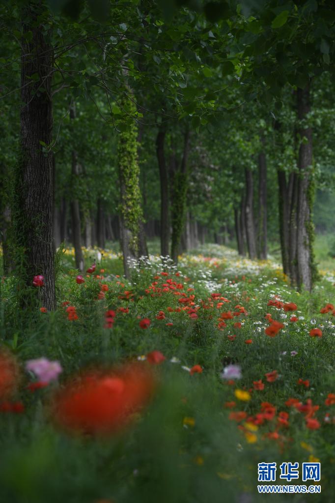 在東林鎮(zhèn)東升村,田野邊的樹林中鮮花盛開(5月7日攝)。