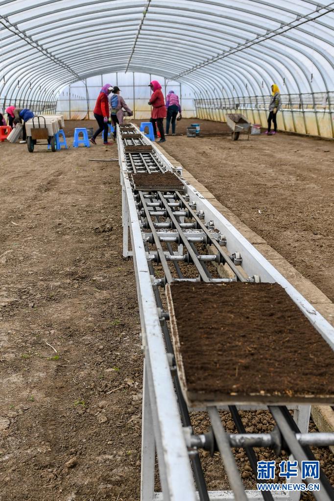 在吉林省吉林市永吉縣九月豐家庭農場,水稻育秧生產線將種好種子的秧盤送到農民手中(4月13日攝)。新華社記者 張楠 攝
