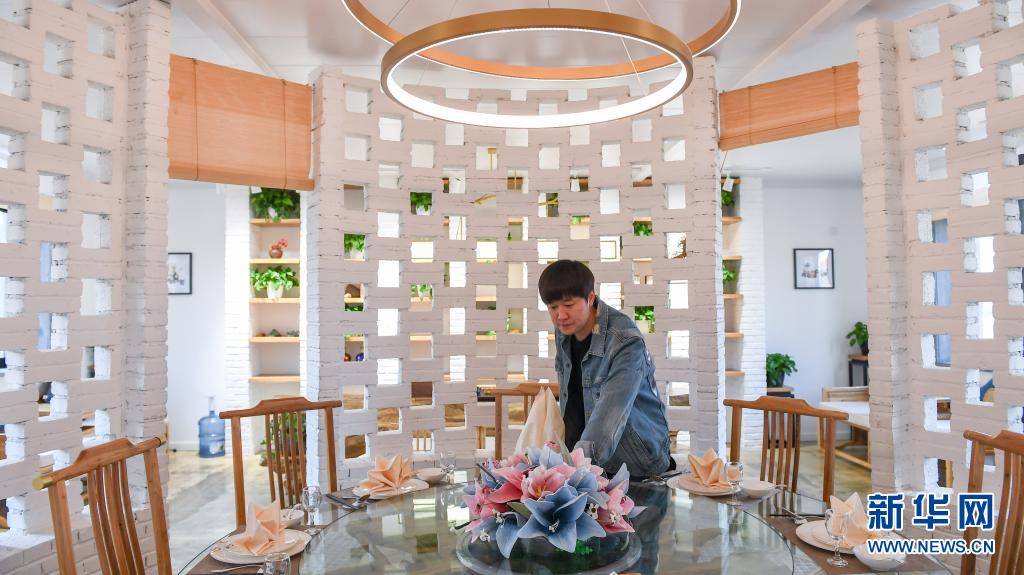 在吉林市船營區(qū)大綏河鎮(zhèn),創(chuàng)業(yè)者曹曦在民宿餐廳內擺放餐具(4月20日攝)。新華社記者 張楠 攝