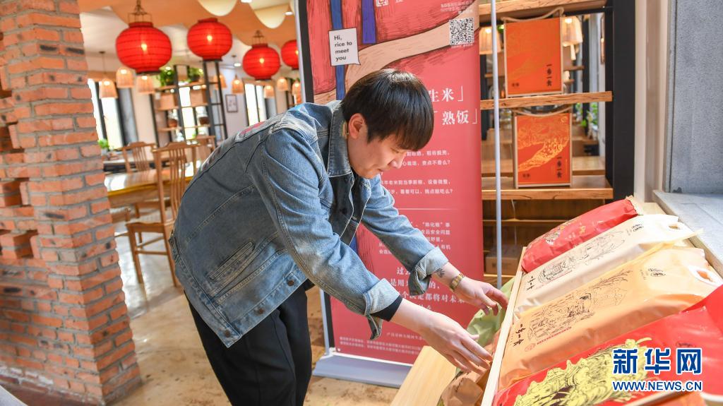 在吉林市船營區(qū)大綏河鎮(zhèn),創(chuàng)業(yè)者曹曦將農場生產的大米擺在民宿顯眼位置進行展示(4月20日攝)。新華社記者 張楠 攝