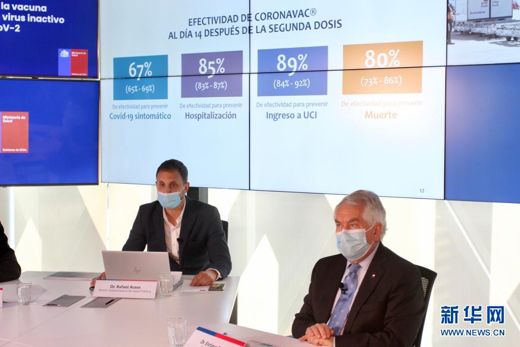 4月16日,智利衛(wèi)生部長(zhǎng)帕里斯(右)與智利衛(wèi)生部顧問阿勞斯在圣地亞哥出席發(fā)布會(huì),公布中國科興新冠疫苗保護(hù)效果在該國的真實(shí)世界研究結(jié)果。新華社發(fā)(智利衛(wèi)生部供圖)