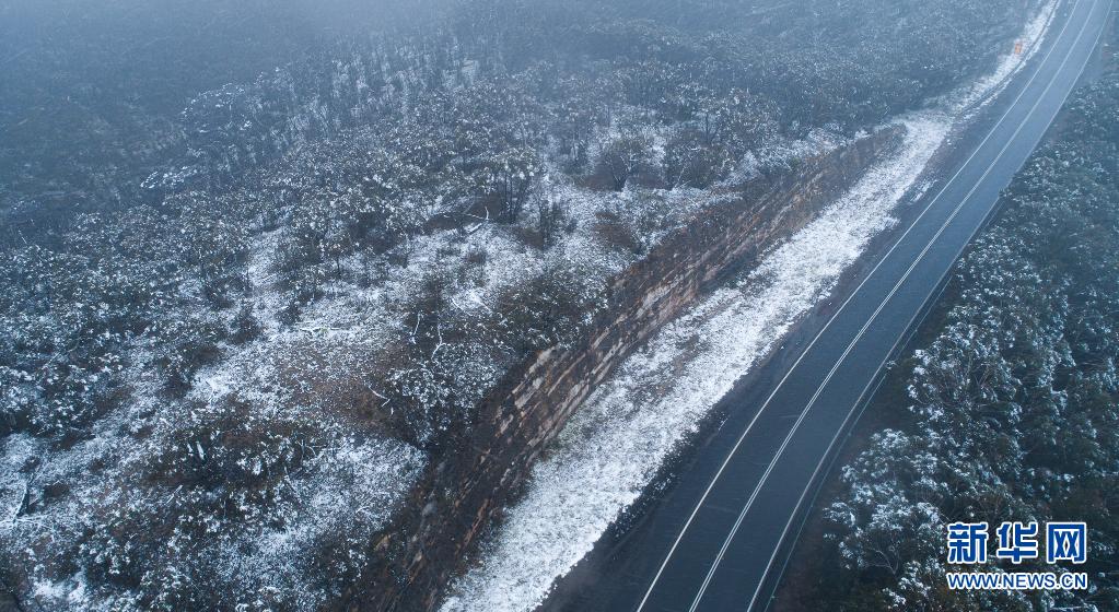 這是6月10日在澳大利亞新南威爾士州藍(lán)山地區(qū)拍攝的一條雪后公路(無人機(jī)照片)。