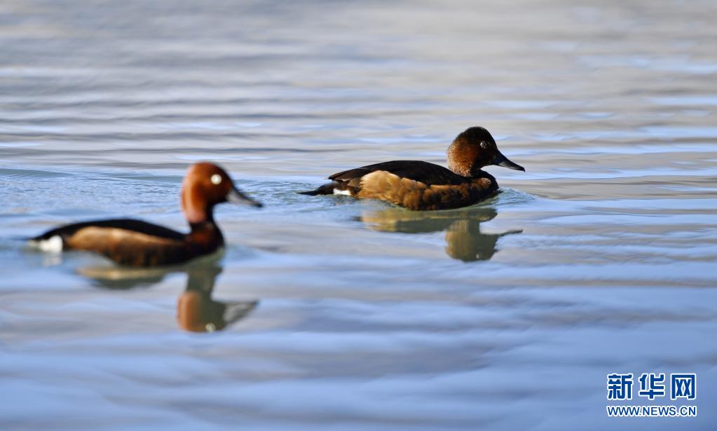 6月14日在拉魯濕地拍攝的兩只小??。夏日里,鳳頭??和小??在西藏拉薩拉魯濕地國家級自然保護區(qū)水面上嬉戲。新華社記者 張汝鋒 攝