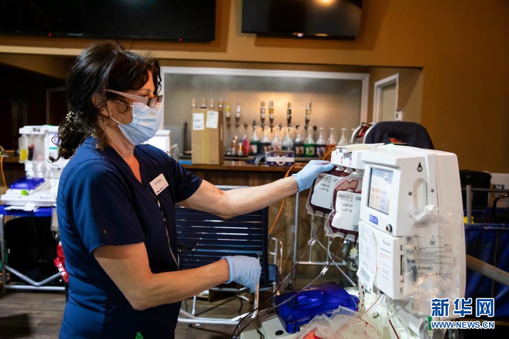 6月14日,在美國紐約州長島地區(qū)的貝肖爾,工作人員在美國紐約血液中心舉行的獻血活動上處理采集的血液。