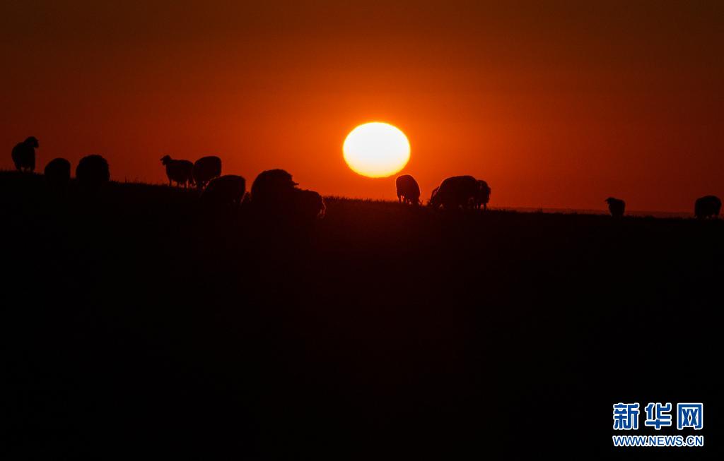 落日映紅新疆裕民縣巴爾魯克山區(qū)夏牧場(chǎng)的天空,羊群仍流連于牧草,緩緩而歸(6月15日攝)。
