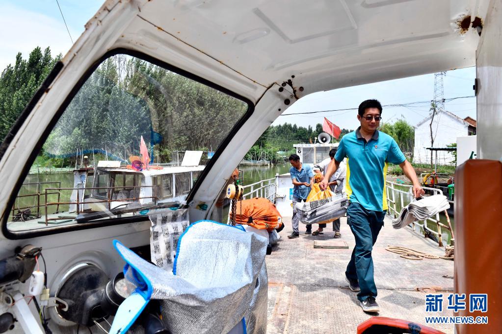 6月20日,在微山縣南陽鎮(zhèn)南陽碼頭,郵遞員王少朋從渡輪上搬卸郵件。南陽鎮(zhèn)的郵件往來全靠船進(jìn)船出。