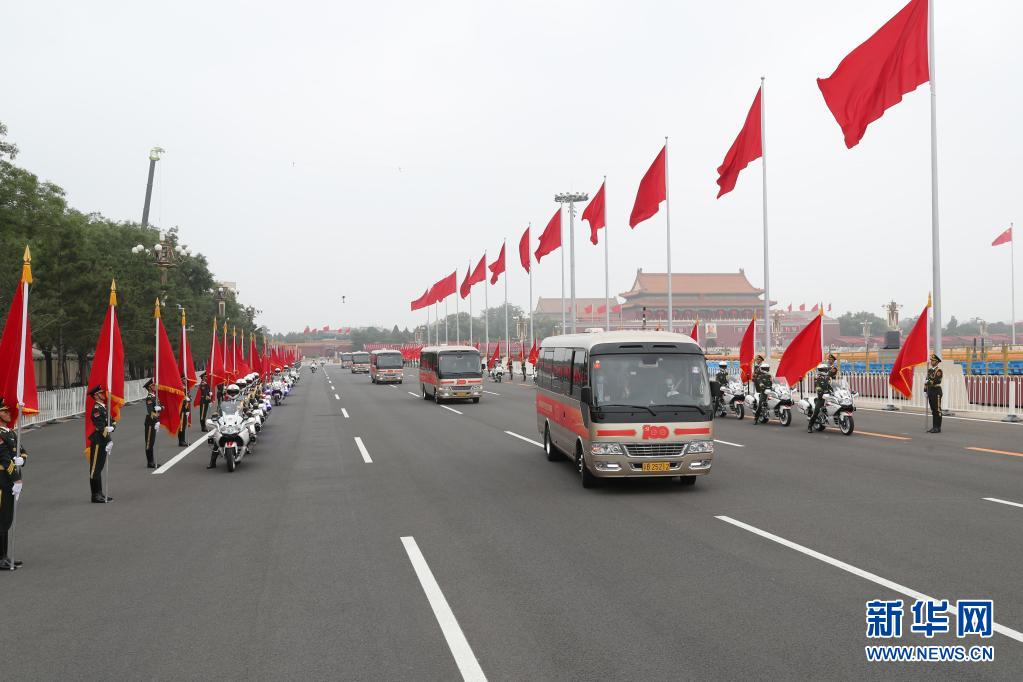這是“七一勛章”獲得者集體乘坐禮賓車從住地出發(fā),由國賓護(hù)衛(wèi)隊(duì)護(hù)衛(wèi)前往人民大會(huì)堂。