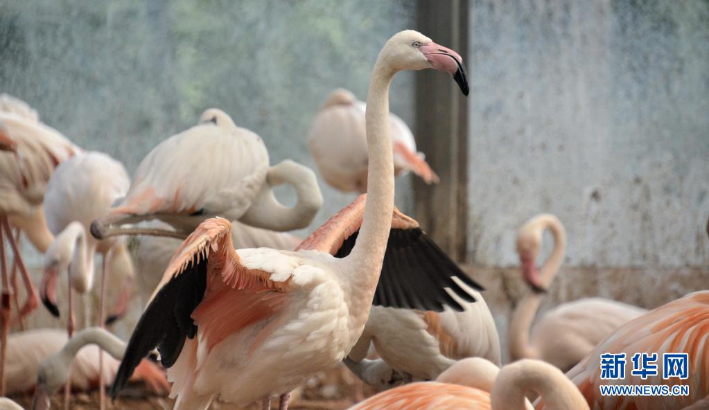 北京動物園內(nèi)的火烈鳥在室內(nèi)乘涼(6月28日攝)。