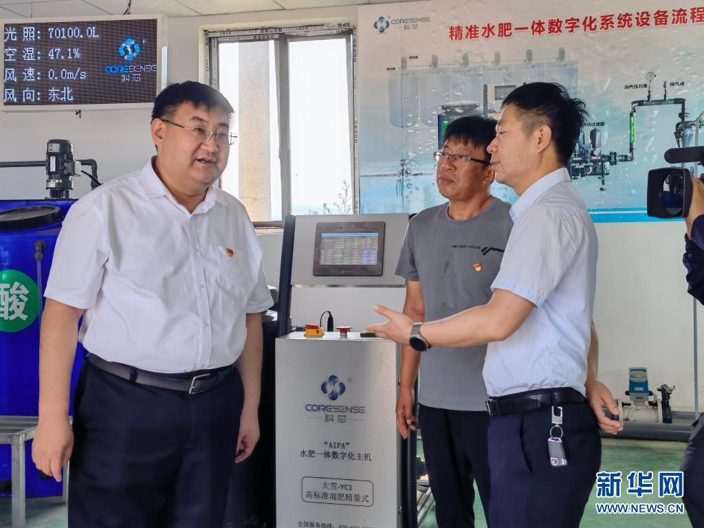 6月23日,劉偉(左一)在太谷區(qū)閆村科芯園區(qū)水肥一體化車間調(diào)研。新華社發(fā)