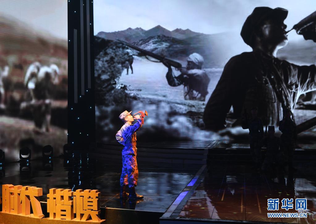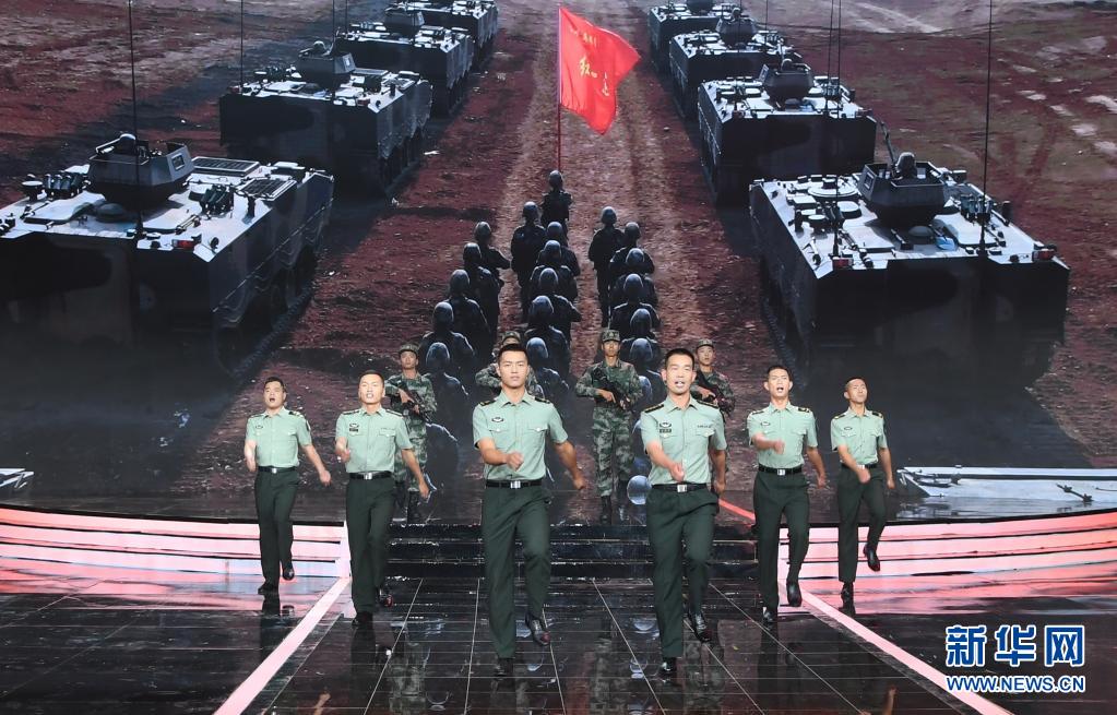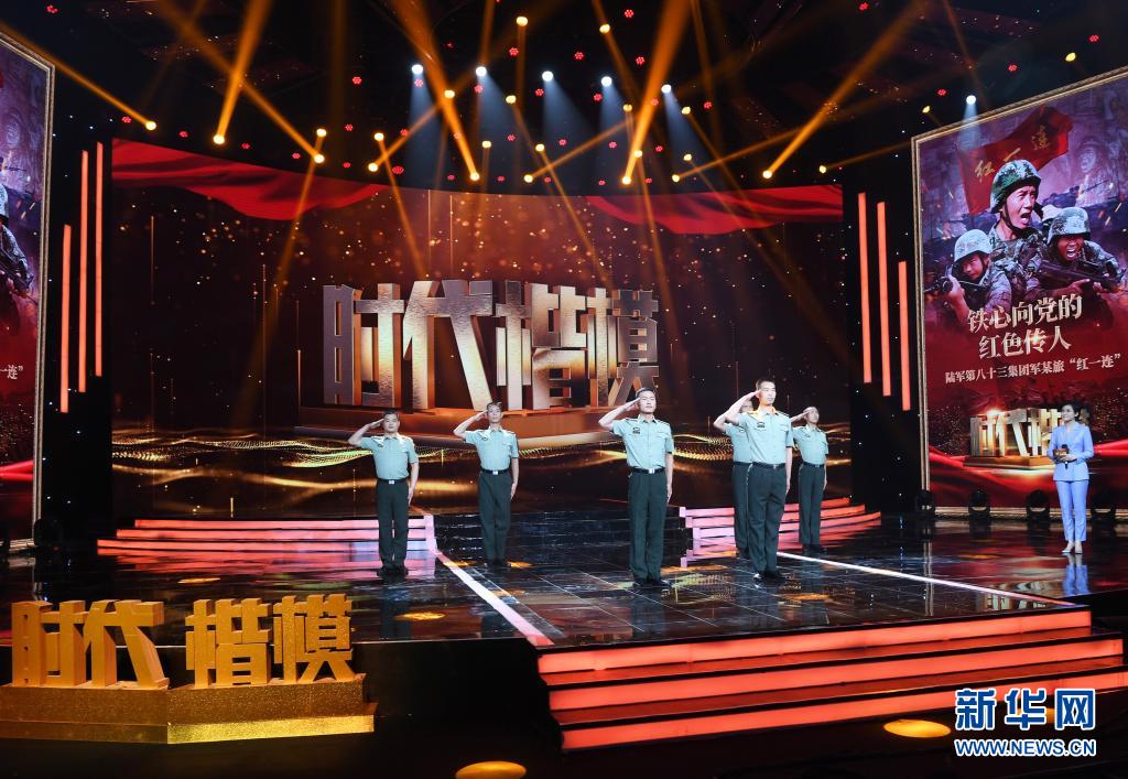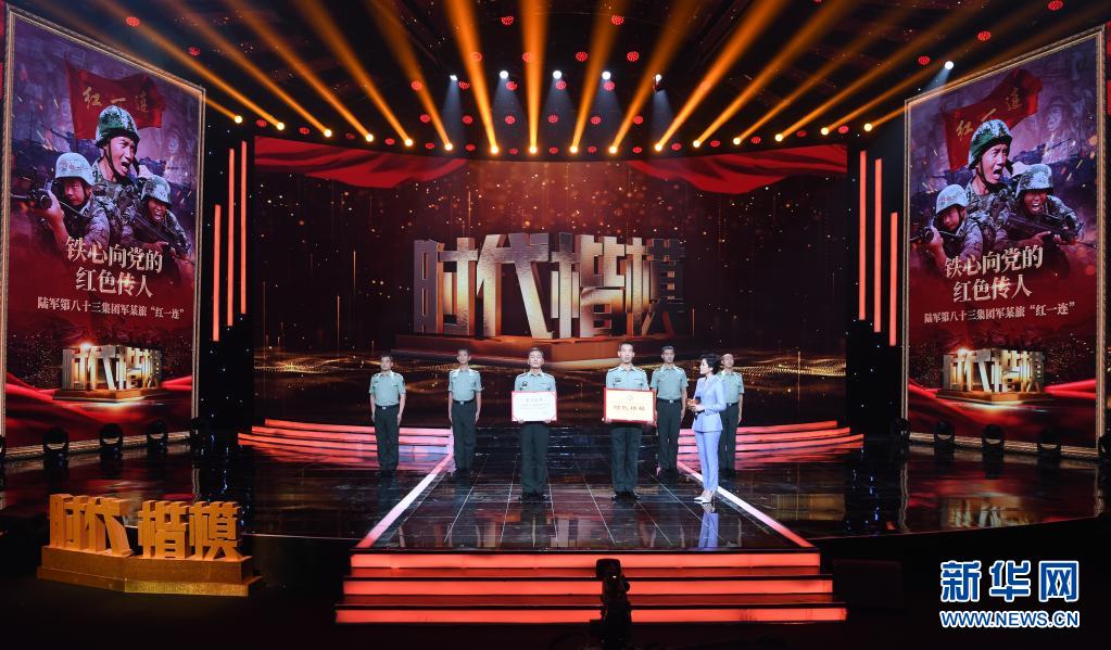 在“時(shí)代楷模”發(fā)布儀式上,陸軍第八十三集團(tuán)軍某旅“紅一連”官兵代表表演節(jié)目《紅色堡壘》(7月23日攝)。新華社記者 張永進(jìn) 攝