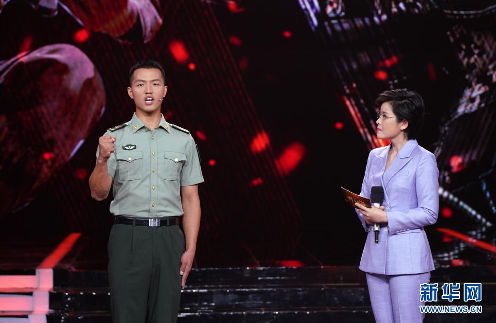 在“時(shí)代楷?!卑l(fā)布儀式上,陸軍第八十三集團(tuán)軍某旅“紅一連”副班長徐謙(左)講述黨員骨干“跟我來”的故事(7月23日攝)。新華社記者 張永進(jìn) 攝
