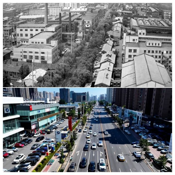这是一张拼接图片,上图为20世纪70年代,铁西区北二路两侧工业企业鳞次栉比;下图为如今,北二路两侧汽车4S店星罗棋布。(铁西区委宣传部供图)