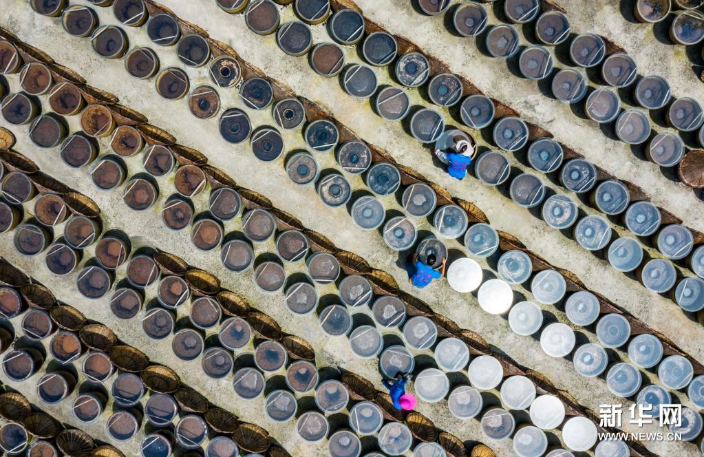 7月10日,工人在畢節(jié)市金沙縣禹謨鎮(zhèn)泡木灣醬醋基地查看醬醋晾曬情況(無(wú)人機(jī)照片)。新華社發(fā)(范暉攝)