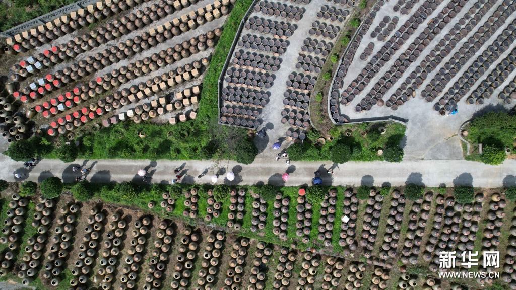 7月10日,游客在畢節(jié)市金沙縣禹謨鎮(zhèn)泡木灣醬醋基地參觀(無(wú)人機(jī)照片)。新華社發(fā)(韓賢普攝)