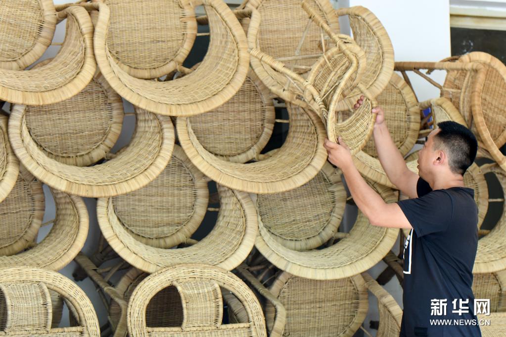 7月10日,在遵義市匯川區(qū)板橋鎮(zhèn)婁山關(guān)社區(qū),居民在藤編作坊里堆放藤椅成品。新華社發(fā)(羅星漢 攝)
