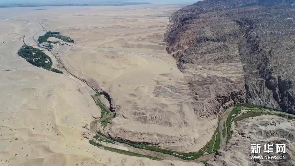 鳥瞰大泉河及其流經(jīng)的敦煌莫高窟(7月6日攝,無人機照片)。新華社記者 劉詩平 攝
