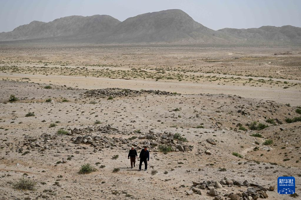 5月13日,驼峰(长城)文物保护队员许继龙(右)和乌仁其其格在巡查阿拉善左旗一处石圈遗址。