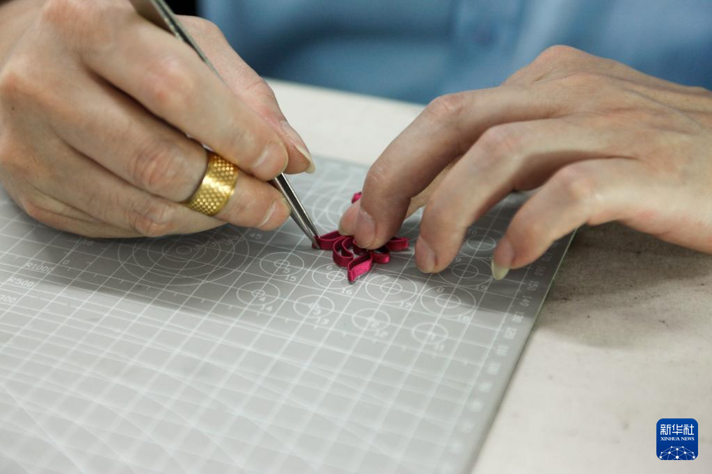5月31日,江满宗在上海市“龙凤旗袍制作技艺——国家级非物质文化遗产传习所”制作盘扣。