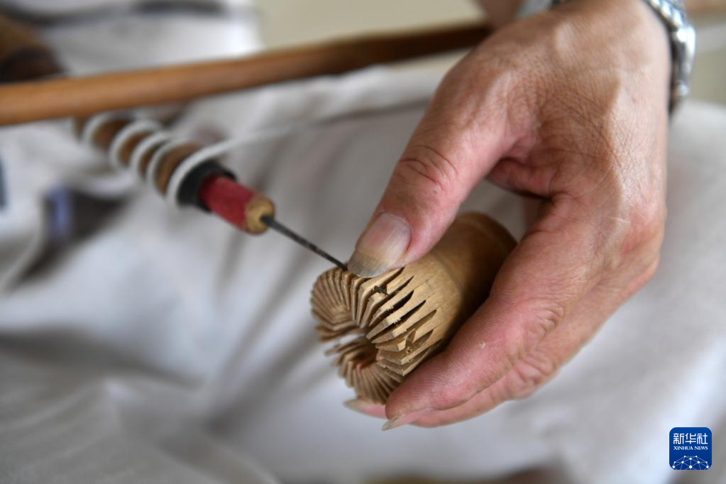 6月1日,在广西宾阳县宾州镇陆村,陆云岗在给木头打孔准备制作油纸伞。