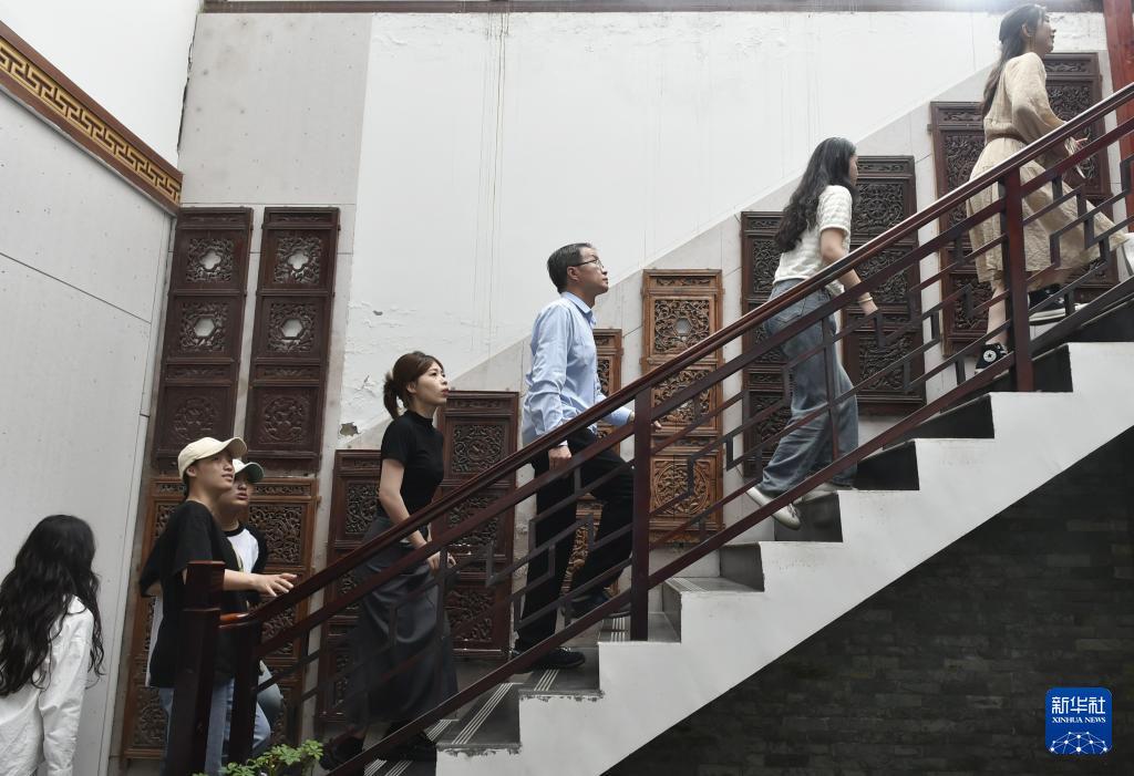 6月7日,张俊涛在开封市“汴京灯笼张”彩灯展览馆内向来访的大学生们介绍自己收集的家用传统木雕。