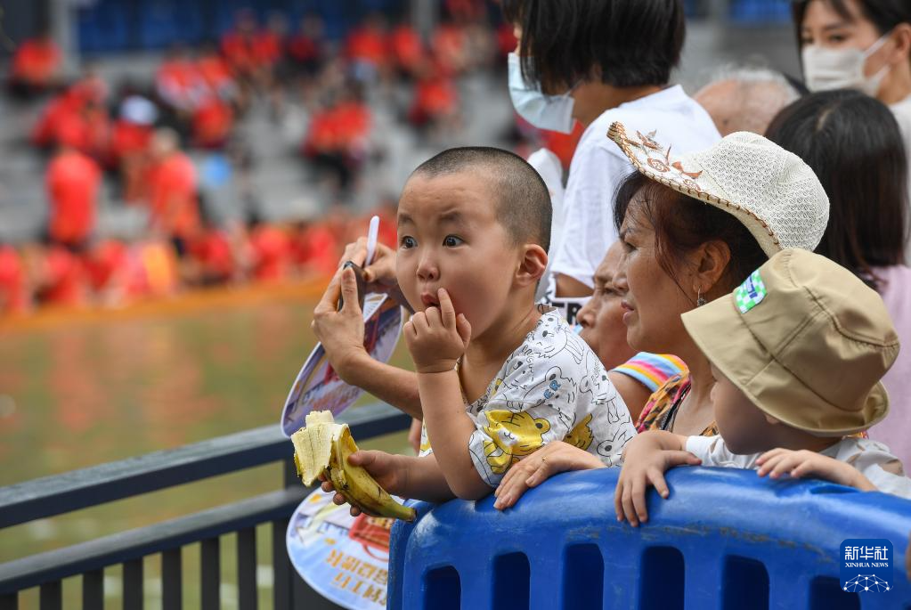 6月15日,小朋友被精彩的车陂龙舟赛吸引。