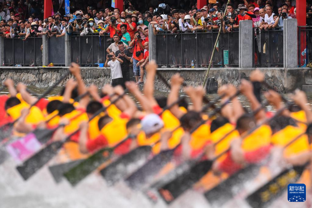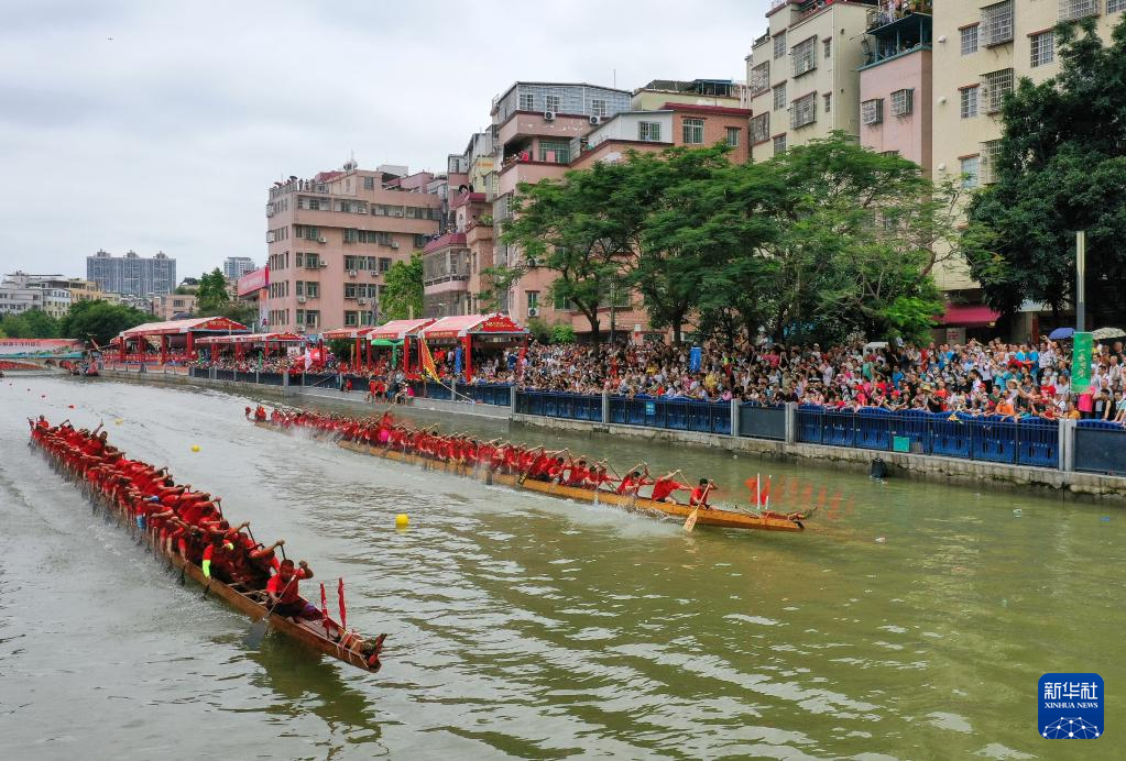 自农历四月初八“起龙舟”开始,广州地区就开启了划龙舟、迎端午的年度大戏。6月15日,车陂村12条龙船在车陂涌进行龙舟竞渡。