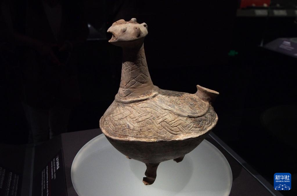 6月19日在特展上拍摄的浙江海盐西塘桥采集的三足鸟形陶盉。