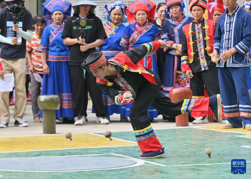 7月11日,在大化瑶族自治县仁良村,村民在陀螺文化展演活动中打陀螺。