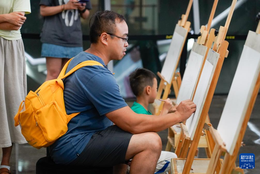 7月16日晚,参观者在世博会博物馆艺术互动区体验作画。