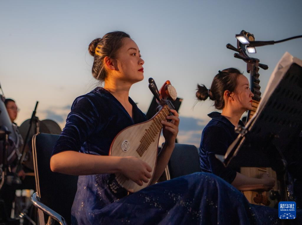 来自昆明聂耳交响乐团及昆明市民族歌舞剧院民乐团的演奏家们在昆明市滇池畔共同演奏包括《义勇军进行曲》《卖报歌》在内的聂耳代表作(7月17日摄)。