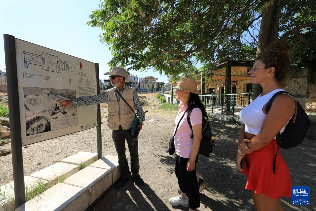 7月26日,在黎巴嫩巴勒贝克,一名导游在向游客介绍巴勒贝克神殿建筑群遗址。