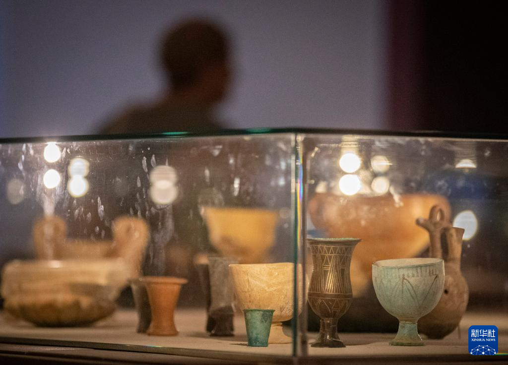 8月2日,参观者在位于西耶路撒冷的以色列博物馆观看古代宴会所用的酒器。