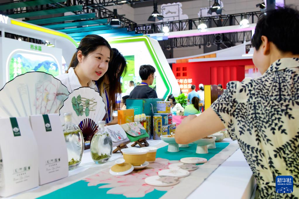 8月17日,参观者在产业成果馆商洛展区了解特色商品。
