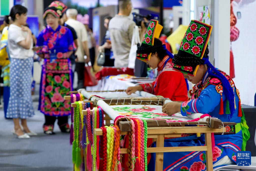 8月17日,在产业成果馆汉中展区,非遗传承人展示刺绣技艺。