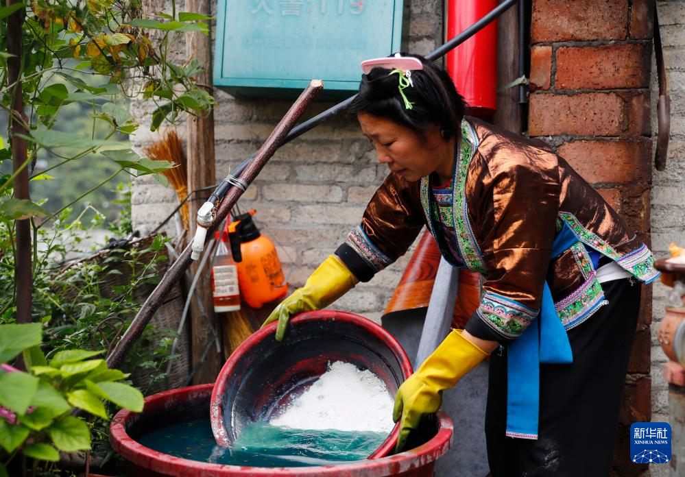 乌英苗寨妇女梁足英用石灰加入蓝靛草浸泡水中调制染料(2023年8月31日摄)。