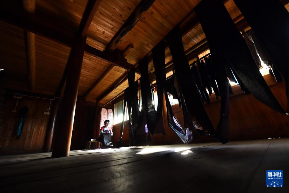 乌英苗寨妇女梁足英在晾晒第一次浸染后的布料(2023年8月31日摄)。