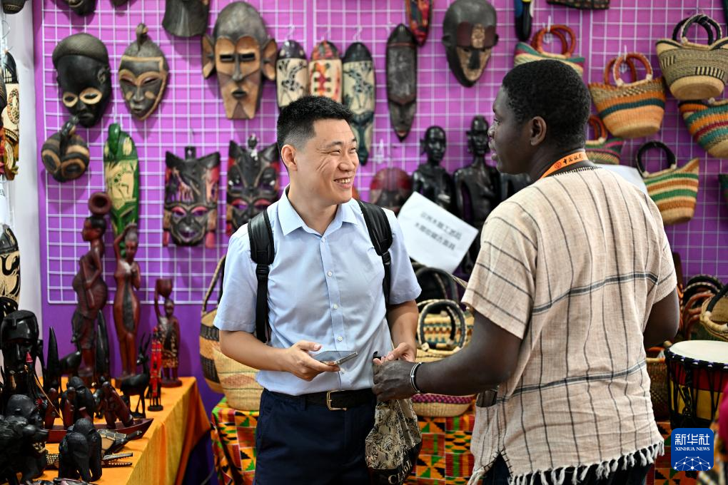 9月6日,一名参观者在服贸会文旅服务专题展区乌干达展台购买手工艺品。
