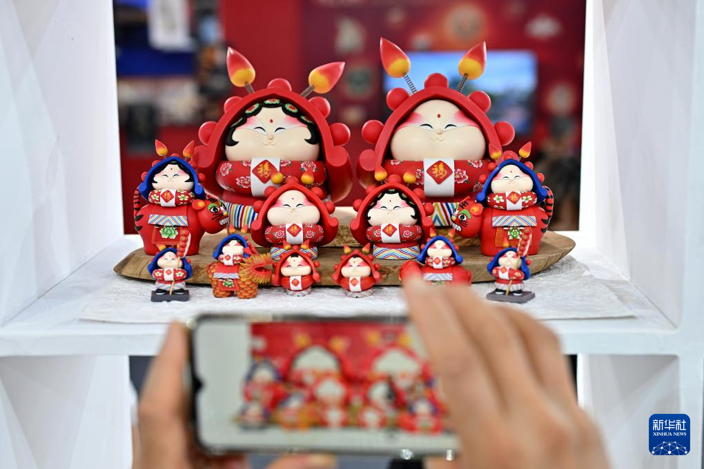 9月6日,参观者在服贸会文旅服务专题展区拍摄一款兔爷文创产品。