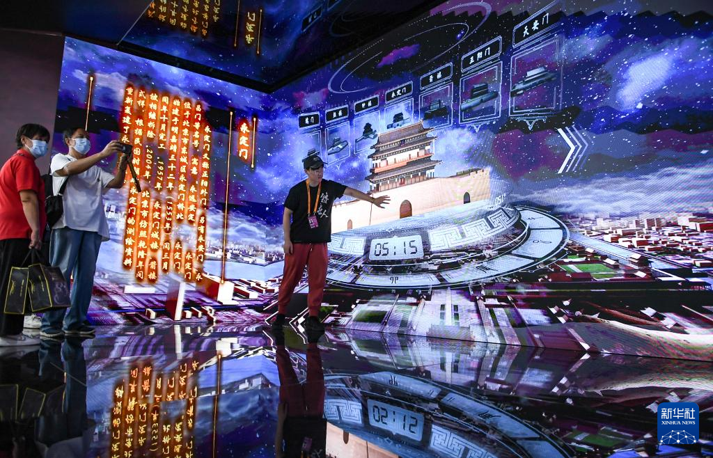 9月6日,北京鲸世科技公司的工作人员(右一)在服贸会文旅服务专题展区向观众演示展现北京中轴线的无穿戴交互产品。