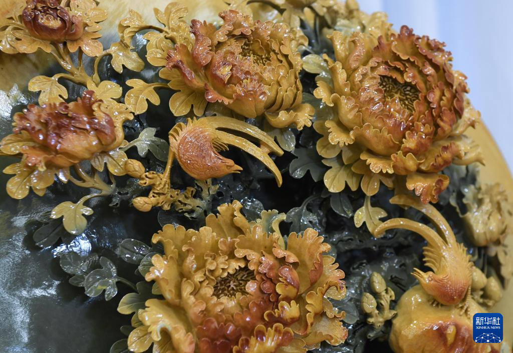 这是10月25日拍摄的柳新祥端砚作品绿端“国色天香砚”的局部。