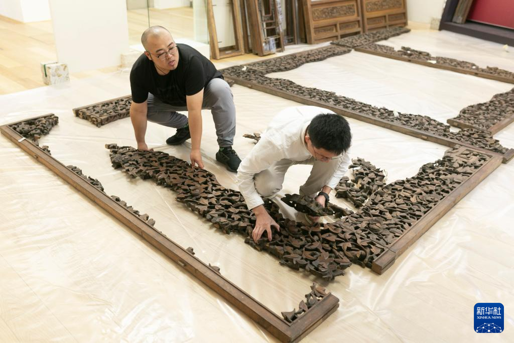 10月16日,在斯洛文尼亚卢布尔雅那的民族志博物馆,故宫博物院专家侯腾龙(左)、黄齐成修复中国古建筑室内装饰。