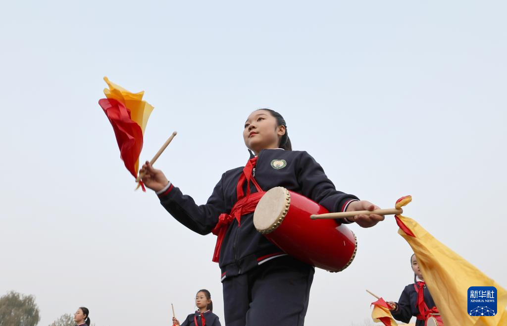 11月22日,河北省霸州市胜芳镇红光小学的学生在表演腰鼓。