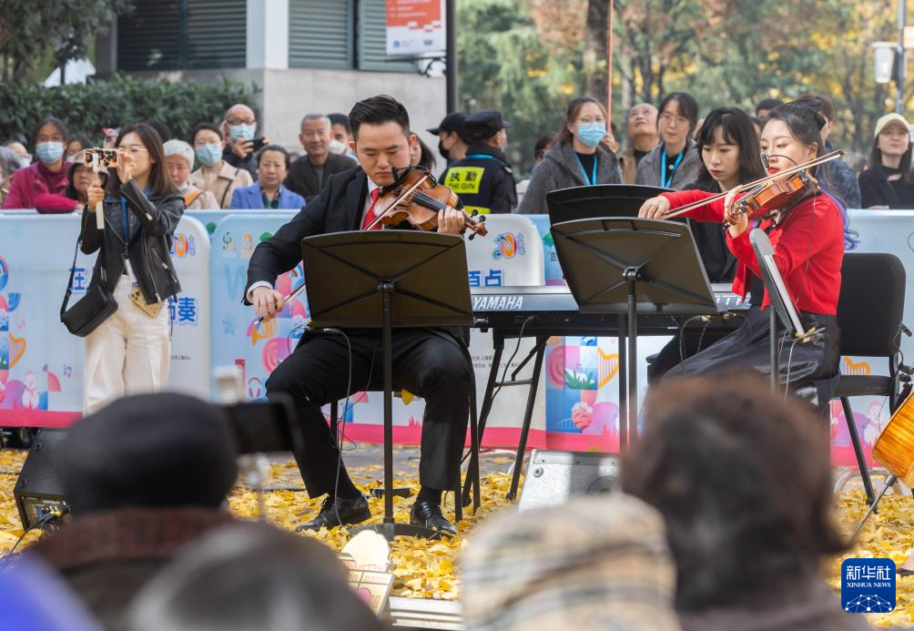当日,一年一度的“银杏音乐会”在上海音乐厅南广场举行。在银杏树下,上海创·室内乐团青年音乐家们演奏多首四重奏经典佳作,上海芭蕾舞团青年演员跳起冬日华尔兹,为市民带来艺术盛宴。