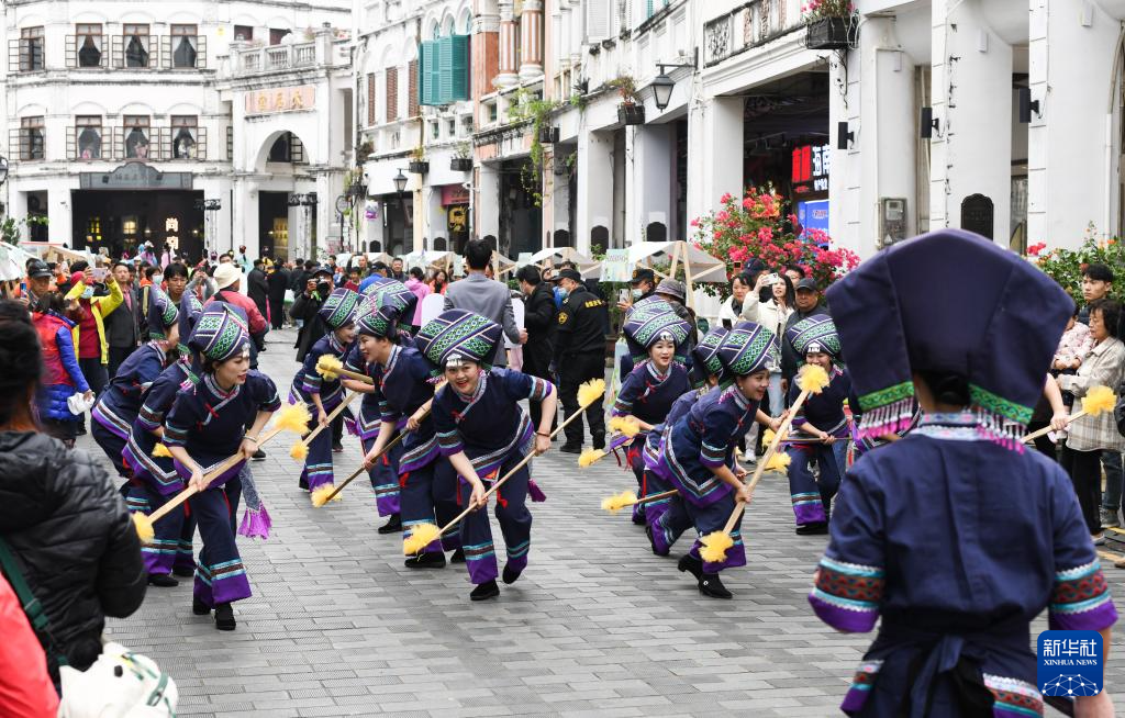 12月23日,来自广西都安瑶族自治县的“壮族打扁担”在海口骑楼老街进行非遗巡游。