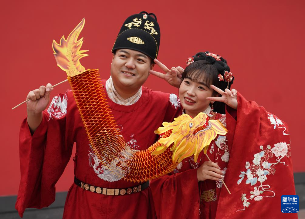 1月15日,杭州南宋德寿宫遗址博物馆外,一对新人手持道具龙拍照。
